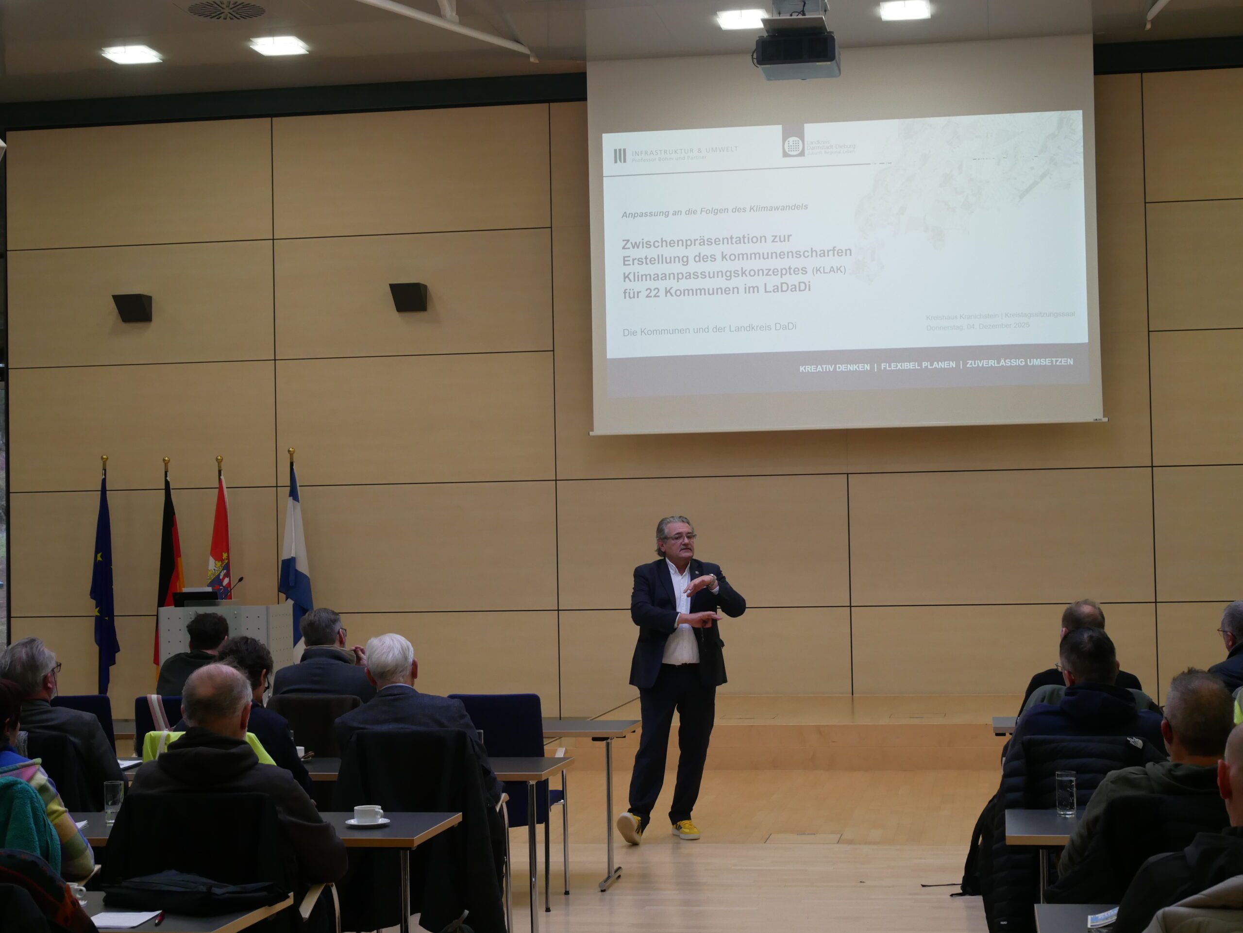 Am 4. Dezember fand im Landkreis Darmstadt-Dieburg die Zwischenpräsentation zum Klimaanpassungskonzept für 22 Kommunen statt. Nach der Eröffnung durch den Landrat Klaus Peter Schellhaas wurde durch Frau Dr. Sandra Sieber (INFRASTRUKTUR & UMWELT) der aktuelle Stand der Arbeiten zum Klimaanpassungskonzept vorgestellt.