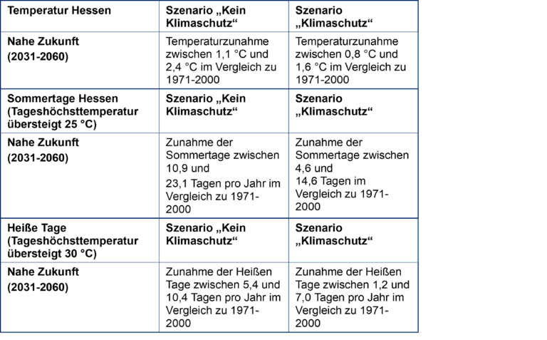 Bei hessenweiter Betrachtung treten im Rhein-Main-Gebiet sogenannte „Temperaturkenntage“ wie „Sommertage“ (Tageshöchsttemperatur über 25 °C) und „Heiße Tage“ (Tageshöchsttemperatur über 30 °C) am häufigsten auf. Im direkten Vergleich von 1961-1990 und 1991-2020 ist ein deutlicher Anstieg der Anzahl an „Sommertagen“ in ganz Hessen zu verzeichnen. In Südhessen bzw. der Rheinebene können „Heiße Tage“ mit über 30 °C bis zum Ende dieses Jahrhunderts ein Drittel des Sommers ausmachen.